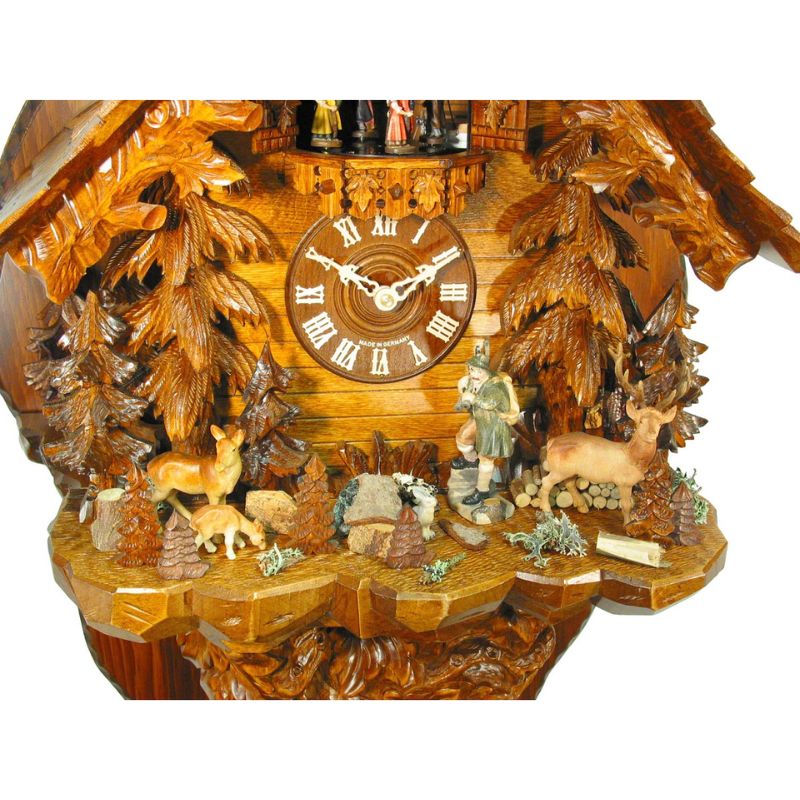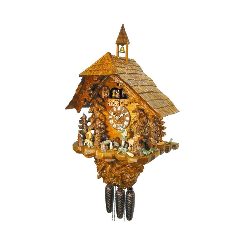 – Đến mỗi giờ, trước tiên cửa sổ sẽ mở và chú chim sẽ nhảy ra hót và cánh tay cầm súng của bác thợ săn sẽ chuyển động theo tương ứng với giờ hiện tại. Sau đó 1 bài nhạc nổi lên, các vũ công trên tầng 2 xoay theo tiếng nhạc.