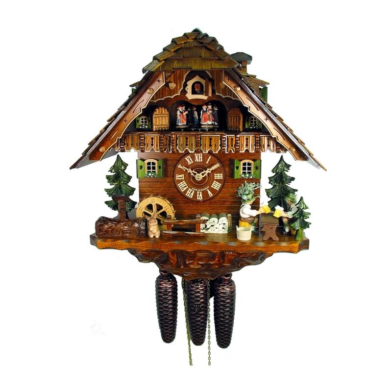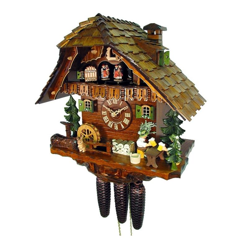 – Mỗi giờ, cửa sổ sẽ mở và 1 chú chim sẽ nhảy ra hót báo hiệu đúng số giờ, 2 người đàn ông ngồi uống bia sẽ cụng ly nhau đồng thời đồng hồ sẽ gõ vào gông đồng số tiếng tương ứng. Sau đó nhạc sẽ nổi lên, những hình người đang khiêu vũ dưới chú chim sẽ chuyển động theo tiếng nhạc và bánh xe nước chạy theo.