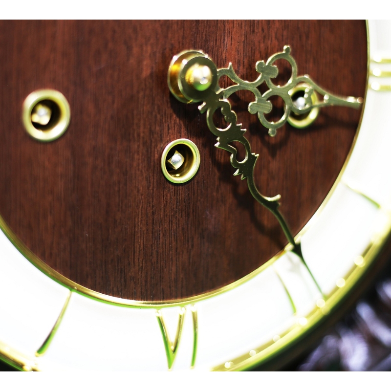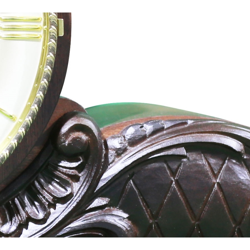 Nổi bật trên nền vân gỗ tự nhiên là từng đường nét hoa văn theo phong cách châu Âu được chạm khắc tỉ mỉ, mang lại cảm giác sang trọng, cổ điển và sự gẫn gũi, ấm áp. Mặt số với viền được làm bằng đồng, cọc số La Mã tinh xảo.