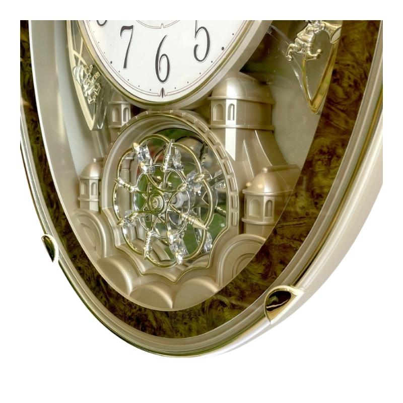 – Đồng hồ có quả xoay gắn pha lê quay nhẹ nhàng phía dưới. 2 bên mặt số có quả lắc với 4 thiên thần lắc nhịp nhàng khi đồng hồ chạy.
