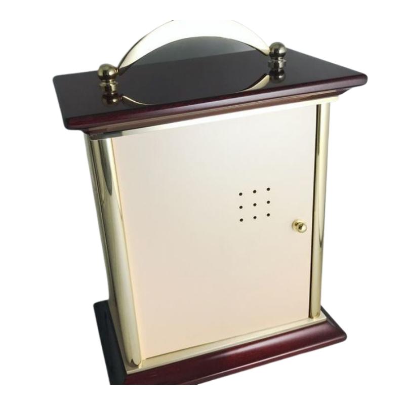 – Vỏ đồng hồ làm từ gỗ phủ sơn mài và thép không gỉ mạ vàng.